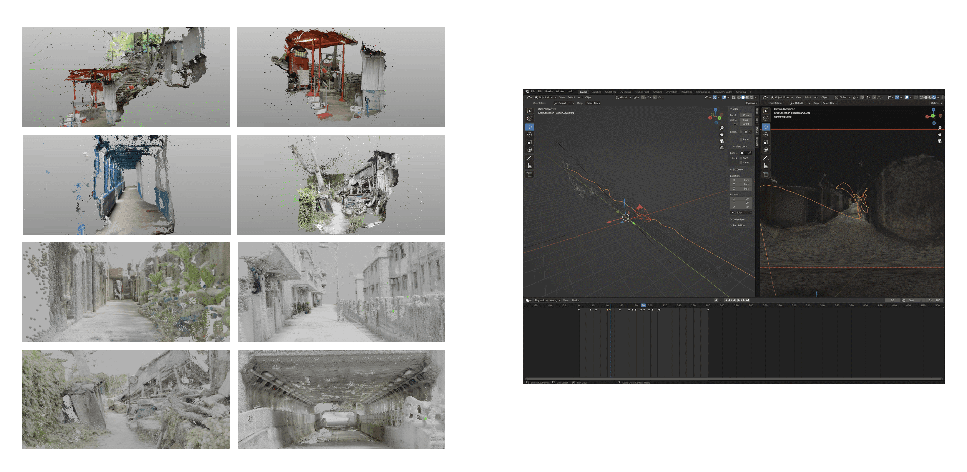 Investigating the bat’s jorney and 3D scanning the city, rendering the point clouds in Blender. In the Blender, designing the camera paths and a bat’s headmovement.