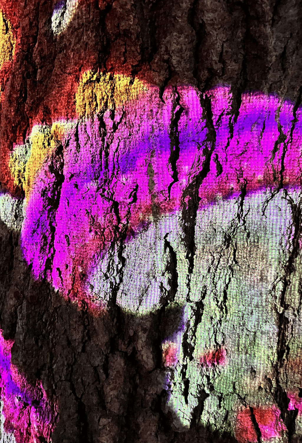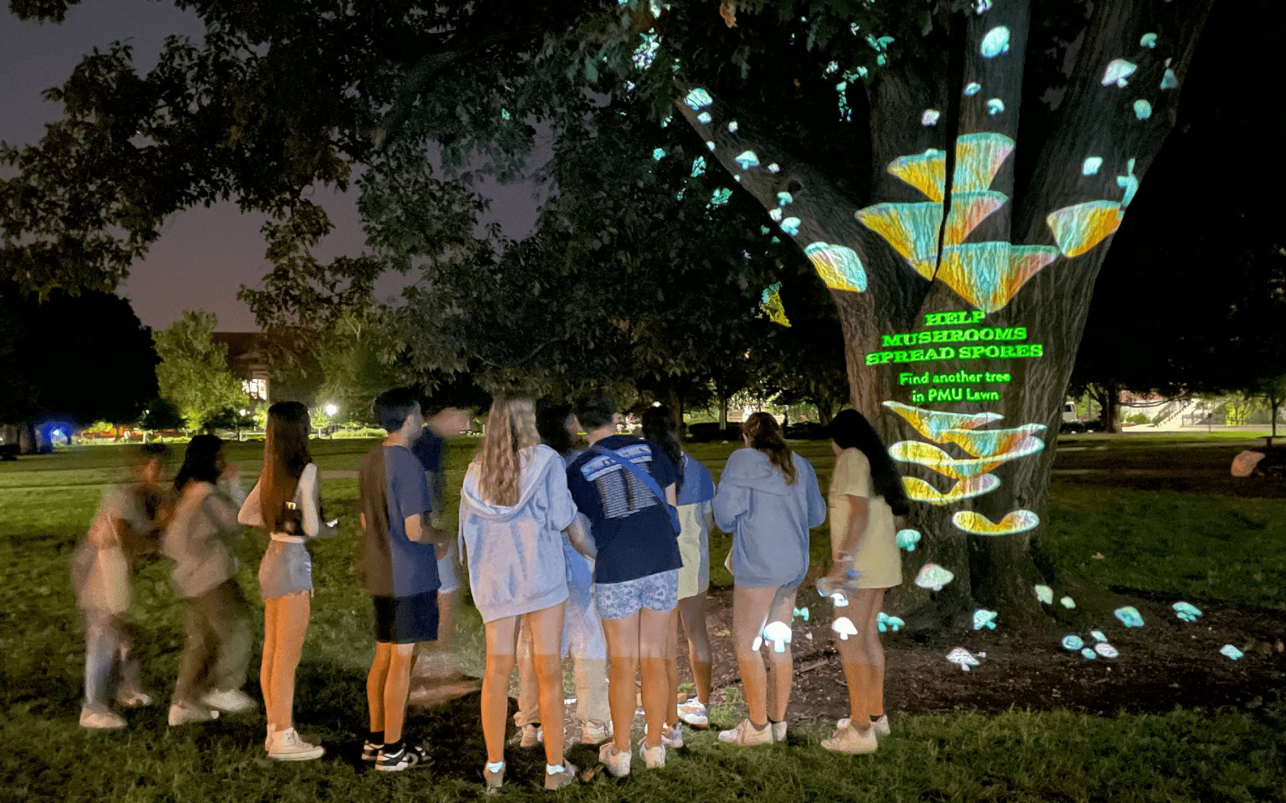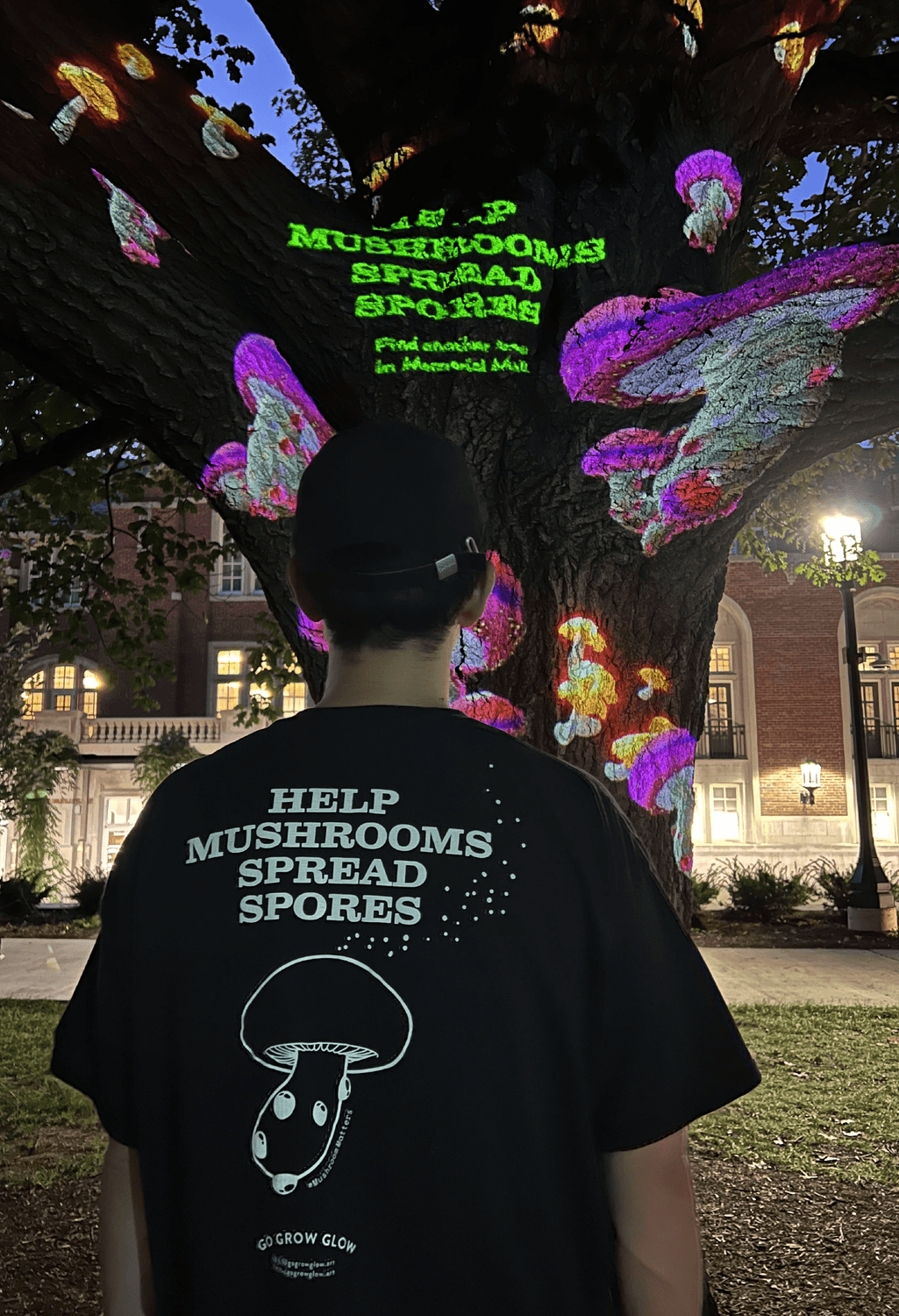 Go, Grow, Glow is an interactive outdoor projection mapping installation funded by Purdue University. Referencing ideas of sustainability and community, the work allows visitors to influence simulated mushroom growth and propagation. They do so by changing their proximity to trees which serve as large scale screens for projected real-time 3D animations of various mushroom types.