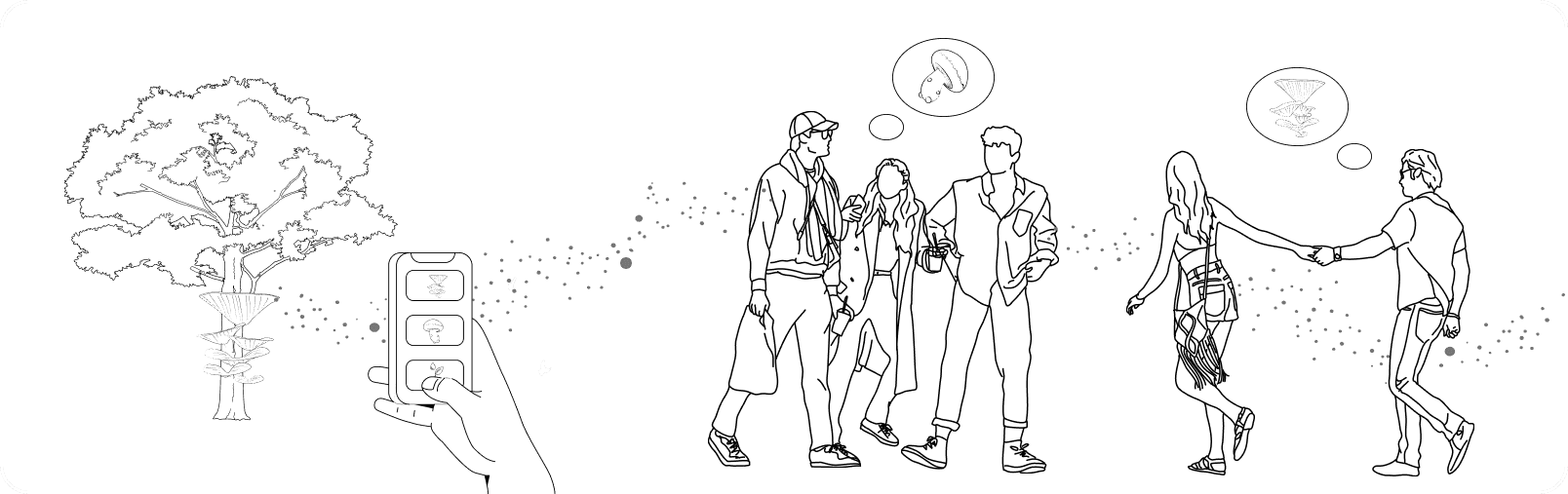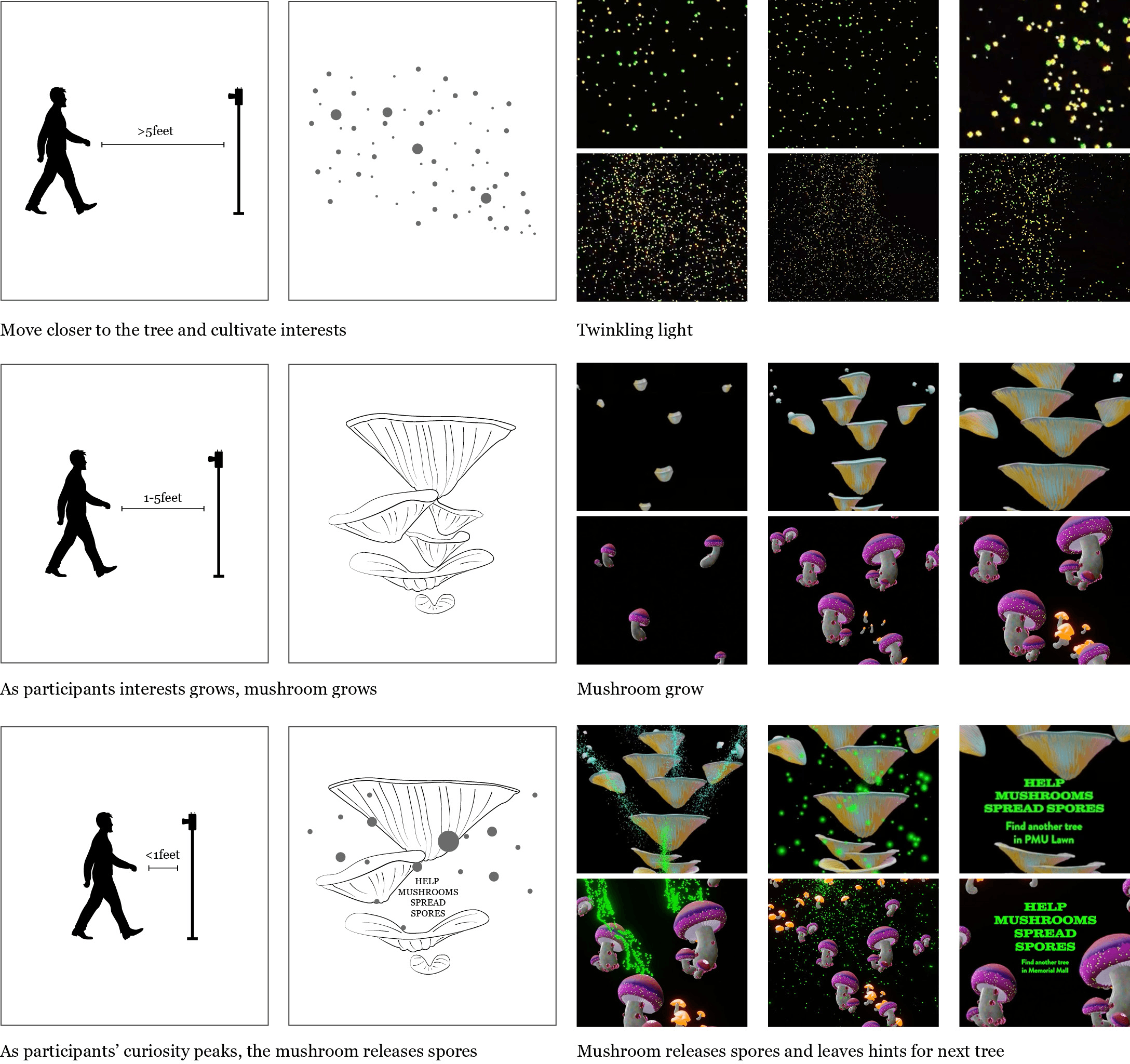 The system of this project functions like a game. Typically, the mushrooms disperse spores by the wind or insects. In this project, the participants will play the role of “insects,” and the campus can be a big playground. The mission of participants is to across the campus to help mushrooms to reproduce. During this process, participants will get opportunities to explore and become familiar with the campus.